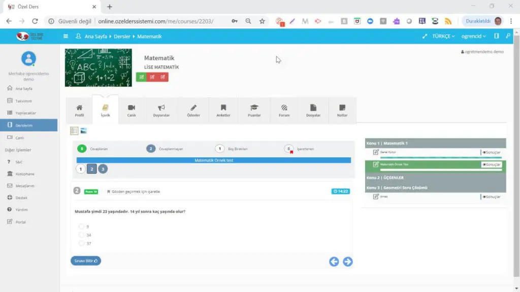 test yapabilir. Sistem aynı zamanda HD kalitesinde interaktif canlı ders, görüşme yapma imkanı da