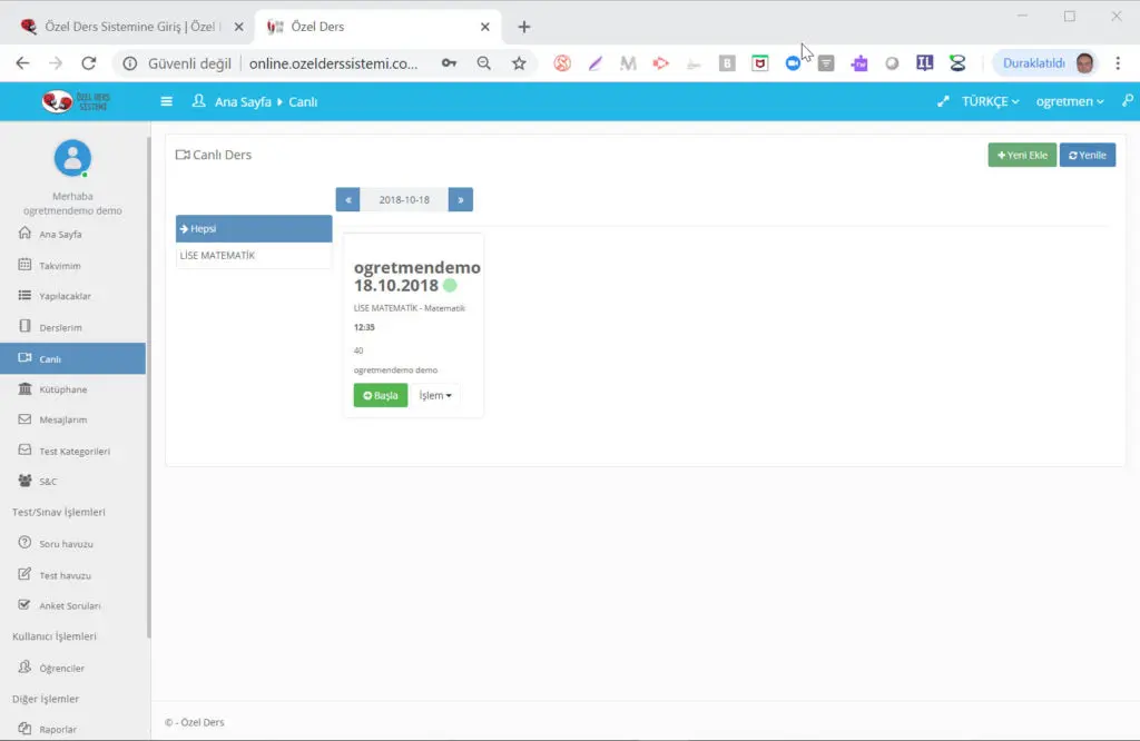 Eğitmen platform üzerinde 1 dakika kadar kısa bir sürede online sınıf oluşturabilir ve eğitim/ders