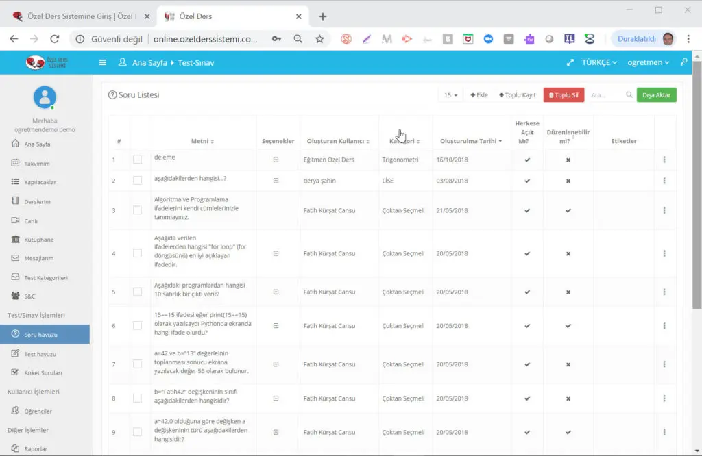 vermeye başlayabilir. Soru havuzuna soru ekleyebilir sonrasında bu sorularla online testler oluşturabilir.